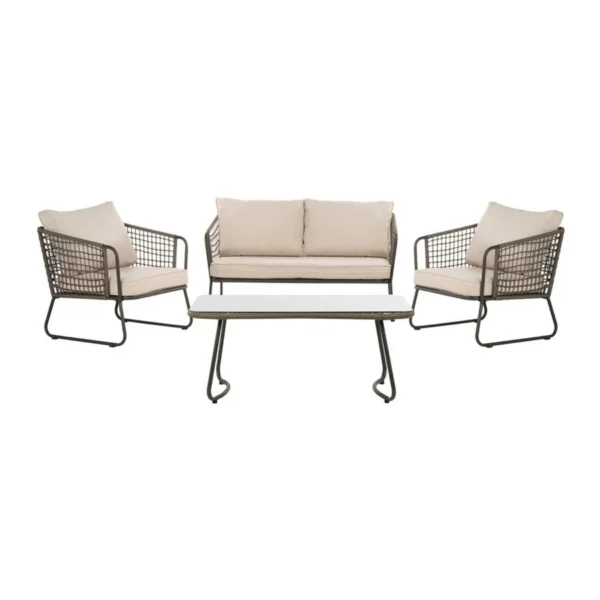 Bring modern elegance and cozy relaxation to your garden, terrace, poolside, or even your living room with this beautifully crafted 4-Piece Outdoor Rope Patio Conversation Loveseat Set. Designed for those who appreciate quality, comfort, and style, this set effortlessly blends indoor sophistication with outdoor durability. Featuring a sleek grey rope design, this patio set includes a two-seater loveseat, two armchairs, and a matching coffee table, offering the perfect setting for morning coffees, evening chats, or weekend lounging. The intricately handwoven rope construction not only adds a stylish contemporary touch but also ensures breathability and flexibility, enhancing your comfort during long seating sessions.
