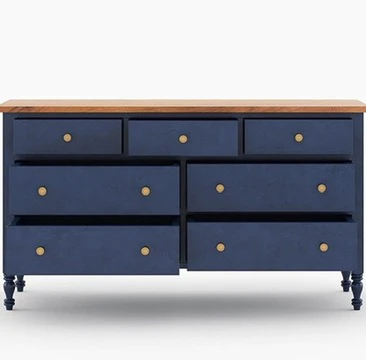 The Indigo Classic Dresser is where form meets function with effortless style. Crafted with a rich navy-blue body and topped with a warm natural wood surface, this 9-drawer piece offers generous storage while adding bold character to your space.
