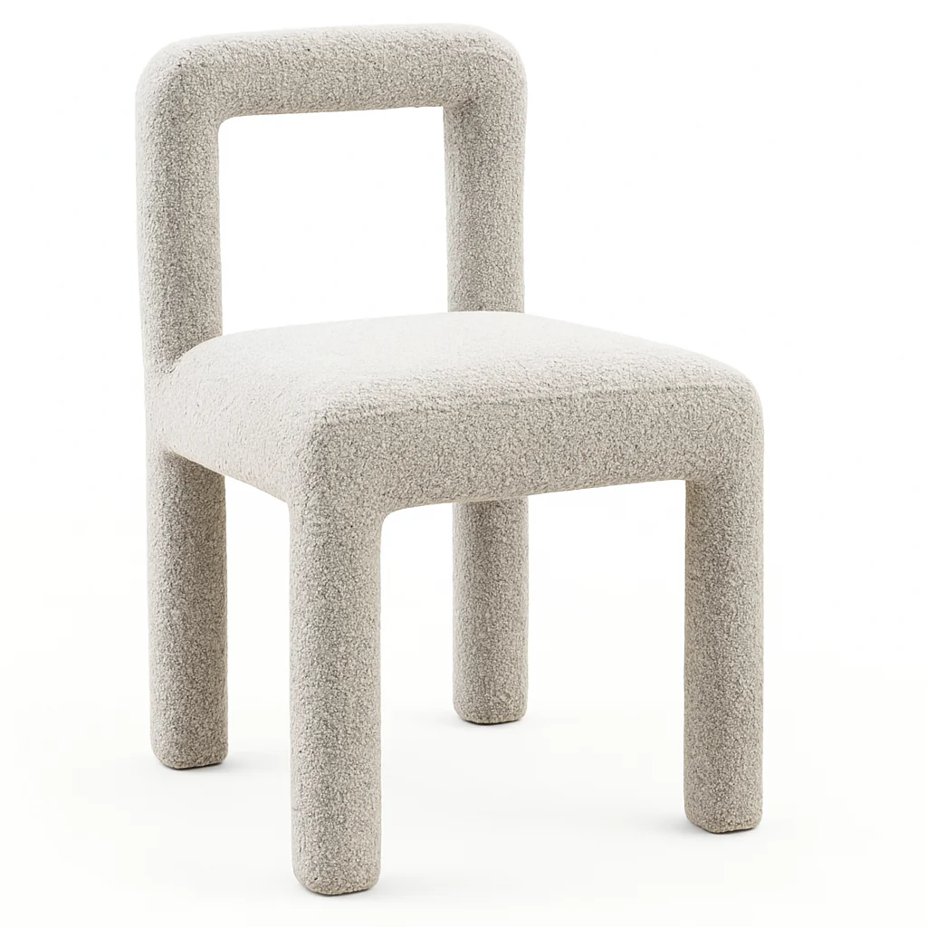 The Loom Dining Chair, wrapped in plush textured fabric, blends playful curves with modern minimalism—offering cozy comfort and sculptural style for your dining space.