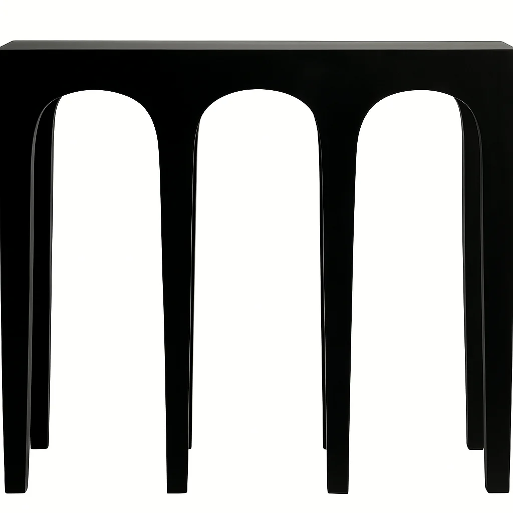 Each tapered leg seamlessly curves into an arch, creating negative space that feels airy yet grounded. Compact in scale, it fits perfectly in narrow entryways, behind sofas, or under art walls, offering a sophisticated platform for decor, lamps, or floral arrangements.