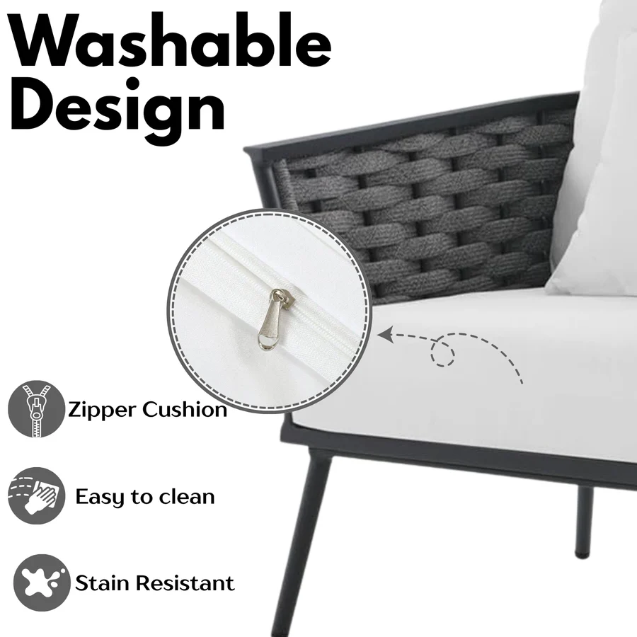 Create a serene and stylish retreat right at home with our 3 Piece Rope Patio Bistro Set with Cushions, designed to elevate your outdoor experience whether you’re sipping morning coffee on the balcony, sharing an evening drink poolside, or enjoying meals in the garden with loved ones. Crafted for both charm and comfort, this set blends contemporary aesthetics with lasting durability, making it a perfect fit for any outdoor setting. The set includes two elegantly designed rope chairs with soft, supportive cushions in an inviting tone, and a compact, matching table ideal for drinks, snacks, or casual meals. The handcrafted rope detailing not only adds a modern, breathable texture but also resists fading and fraying in varying weather conditions. A sturdy metal frame ensures long-lasting stability and rust resistance, while the plush cushions offer ergonomic support, inviting you to relax and unwind for hours.
